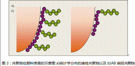 自然這些結構能夠與顏料表面接觸特別多,因此被視為高效的潤濕分散劑。圖3可以看到,和純AB嵌段共聚物相比,每單位體積里接枝聚合物的錨定基團和穩(wěn)定鏈段的數(shù)量要多得多。