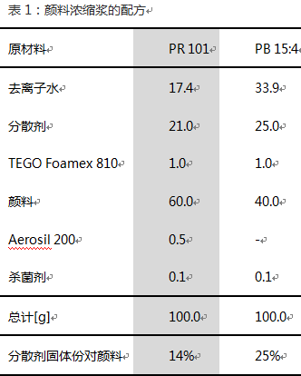 評估的顏料有:PR101,氧化鐵紅;PB15:4,酞菁藍;顏料濃縮漿的配方列于表1。研磨設備為Skandex震蕩機,研磨介質為200 g玻璃珠(ø2.5-2.8mm),分散時間為1小時(PR101)或2小時(PB15:4)。